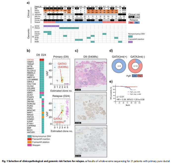 GATA3和PIK3CA突變是隊(duì)列中最常見(jiàn)的突變,分別出現(xiàn)在4例(19%)和5例(24%)患者中。在4例GATA3突變患者中,3例出現(xiàn)IDC復(fù)發(fā)。GATA3突變陽(yáng)性與GATA3突變陰性復(fù)發(fā)的優(yōu)勢(shì)比(OR)為5.5(95%CI=0.63–76.7)。為了進(jìn)一步研究GATA3突變?cè)趶?fù)發(fā)中的意義,對(duì)復(fù)發(fā)腫瘤患者的樣本進(jìn)行額外分析,以確定與配對(duì)原發(fā)性DCI相比的突變狀態(tài)。