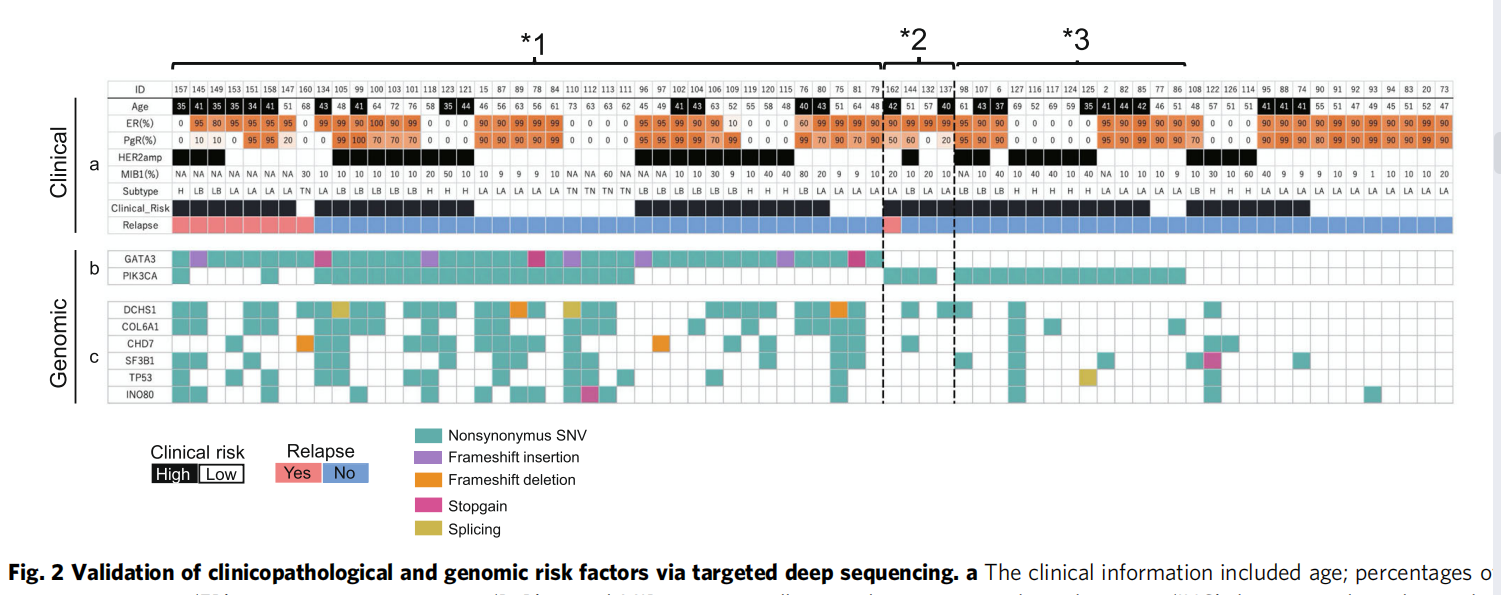 為了確定所識(shí)別的高危標(biāo)記物的分子病因,調(diào)查了另外三名具有代表性的新鮮冰凍標(biāo)本患者?;颊逜患有帶有GATA3突變(圖2,*1)和微侵襲的DCIS,病變被認(rèn)為是真正的DCIS?;颊連患有PgR低表達(dá)的DCIS(圖2,*2)和微侵襲,病變被視為真正的DCIS。患者C患有PIK3CA突變的DCIS(圖2,*3),沒(méi)有任何微侵襲,病變被認(rèn)為可能是假DCIS(低風(fēng)險(xiǎn)DCIS)。