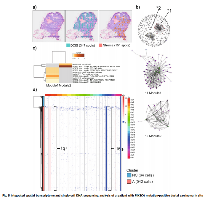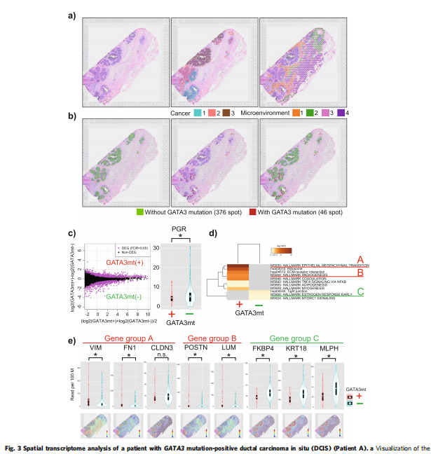 首先,利用空間轉(zhuǎn)錄組學(xué)技術(shù)——10X基因組學(xué)Visium平臺(tái),通過(guò)STseq分析了患者A標(biāo)本的空間基因表達(dá)。該患者在術(shù)前病理診斷中被診斷為DCIS,但在術(shù)后病理診斷中發(fā)現(xiàn)有微侵襲部位。因此,DCIS病變被確定為IDC的真正前兆。平均深度為×2391.4的面板測(cè)序分析顯示該樣本含有GATA3突變(外顯子4:c.865dupG:p。C288fs,變異等位基因頻率[VAF]=7%)。在較高的VAF(外顯子5:c.T1035A:p。N345K,VAF=26.1%),表明新出現(xiàn)的GATA3突變用PIK3CA突變覆蓋了DCIS的基本特征。