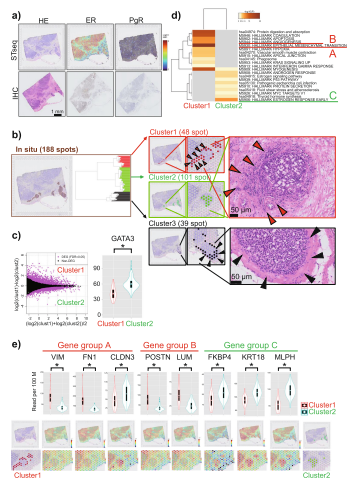 Visium分析發(fā)現(xiàn)了異質(zhì)基因表達(dá),這取決于癌區(qū)和非癌區(qū)細(xì)胞的位置。PgR表達(dá)下調(diào),盡管觀察到高ER表達(dá)(圖4a,上圖),與免疫染色結(jié)果一致(圖4a,下圖)。針對(duì)DCIS細(xì)胞中基因表達(dá)的變化,手動(dòng)選擇了188個(gè)位于導(dǎo)管內(nèi)區(qū)域的形態(tài)學(xué)斑點(diǎn)。這些斑點(diǎn)的無(wú)監(jiān)督分層聚類確定了三個(gè)明顯的聚類(圖4b,左面板)。在空間上,不同的簇對(duì)應(yīng)于不同的區(qū)域(圖4b,中間面板)。重要的是,簇1的48個(gè)斑點(diǎn)(紅色)與DCIS細(xì)胞的位置重疊,DCIS細(xì)胞根據(jù)其形態(tài)即將入侵(由圖4b右面板中的紅色箭頭指示)。同時(shí),簇2(有色綠色)的101個(gè)斑點(diǎn)位于同一導(dǎo)管的中心,并被視為不侵入基質(zhì)的細(xì)胞(由圖4B的中間板中的綠色斑點(diǎn)指示)。簇1和簇2之間的差異表達(dá)分析確定了2747個(gè)DEG(FDR<0.05,圖4c,左)。有趣的是,GATA3表達(dá)在簇1中顯著下調(diào)(圖4c,右圖)。盡管該基因未發(fā)生突變,但該患者的GATA3功能異??赡馨l(fā)生在基因水平。根據(jù)基因富集和通路分析的結(jié)果,該患者始終觀察到以GATA3為中心的基因表達(dá)變化,如患者A所觀察到的(圖4d,e)。共有21條途徑和18個(gè)癌癥特征,包括EMT和血管生成途徑受到影響。如對(duì)患者A所觀察到的,在未侵入間質(zhì)的第2組中,DEG主要代表雌激素反應(yīng)相關(guān)基因??傊谶@名患者身上,我們得出結(jié)論,GATA3通過(guò)其表達(dá)的變化發(fā)揮關(guān)鍵作用。即使沒(méi)有基因組突變,GATA3的異常表達(dá)也可能在某些患者中導(dǎo)致相同的結(jié)果。