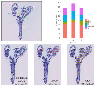 擬南芥花苞中空間轉(zhuǎn)錄組檢測(cè)莖、分生組織、以及3個(gè)不同花區(qū)域空間基因表達(dá),一共檢測(cè)到20215個(gè)基因,鑒定開(kāi)花有關(guān)的兩個(gè)關(guān)鍵基因At5g57720(已知的在S3和S9表達(dá)的基因)和 ATA27 (At1g75940,已知的在S11和S12表達(dá)的基因)的√確的空間定位可視化,組織區(qū)域特異性基因和通路的顯著差異,發(fā)現(xiàn)雄蕊絲發(fā)育通路在S11(雄蕊絲伸長(zhǎng)的位置)和莖中富集,在莖中維管通道大量存在,并且細(xì)胞伸長(zhǎng)和維管發(fā)育過(guò)程非?;钴S。其中花粉外壁形成途徑在S10和S11發(fā)生改變,在這個(gè)階段,外壁是花粉壁的主要組成部分之一,在絨氈層產(chǎn)生并沉積在花粉前細(xì)胞上??臻g基因表達(dá)特征揭示了組織區(qū)域異質(zhì)性,并為植物生長(zhǎng)發(fā)育過(guò)程和相應(yīng)功能的探索提供了高分辨率的空間植物基因表達(dá)模式,從新的維度探索植物發(fā)育過(guò)程。