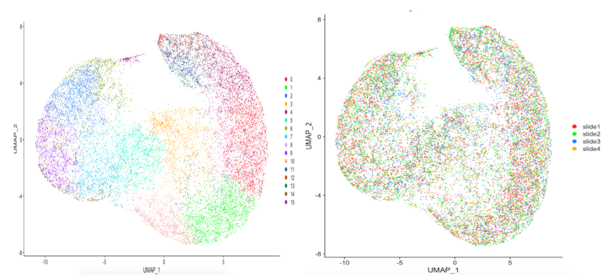 UMAP對(duì)樣本進(jìn)行批次效應(yīng)分析,可視化展示16個(gè)樣本空間基因表達(dá)聚類(lèi)可視化圖。