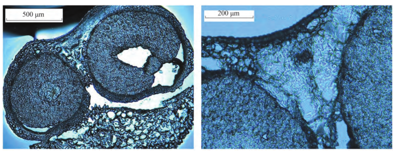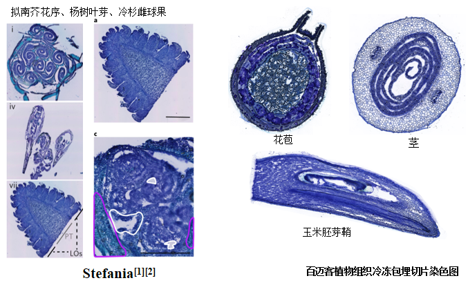 動(dòng)物組織常用HE(蘇木精-伊紅染色法 ( hematoxylin-eosin staining ))染色,可以精準(zhǔn)識(shí)別組織形態(tài)和病理學(xué)鑒定。然而植物的組織存在的纖維素和一些木質(zhì)素不適合HE染色方法,采取的是甲苯胺藍(lán)染色法,其基本原理是植物組織木質(zhì)化細(xì)胞壁呈藍(lán)綠色,其他組織成分呈紫藍(lán)色,可以精準(zhǔn)輔助判斷植物組織形態(tài)學(xué)和確定捕獲區(qū)域。