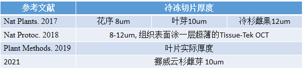 動(dòng)物組織樣本細(xì)胞類(lèi)型,結(jié)構(gòu)相對(duì)比較簡(jiǎn)單,切片厚度比較統(tǒng)一,基本上保持在10μm厚度左右。但是植物樣本組織結(jié)構(gòu)復(fù)雜,而且木質(zhì)化程度不一,組織相對(duì)RNA含量較低,因此植物切片厚度一般根據(jù)樣本類(lèi)型不同,選擇不同的切片厚度,一般植物冷凍切片厚度范圍為10-50um,根據(jù)物質(zhì)組織類(lèi)型切片厚度會(huì)有所不同,視具體情況而定。