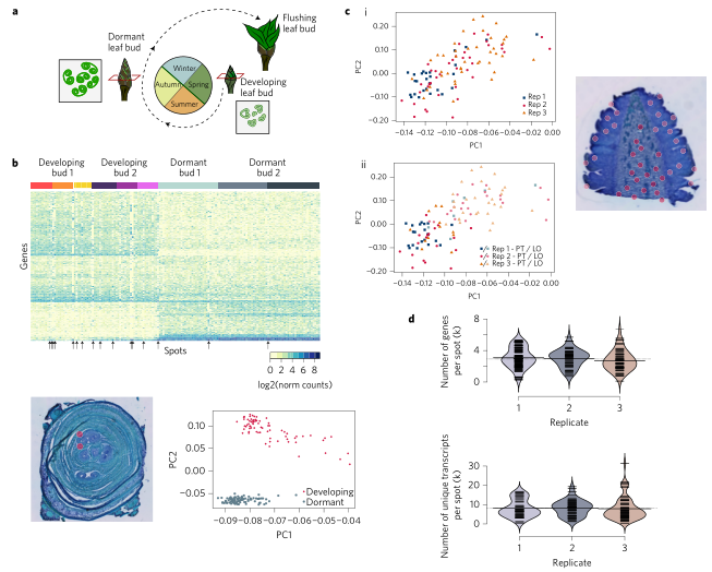 Stefania和 Joakim Lundeberg團(tuán)隊(duì)在2017年就開(kāi)發(fā)了植物上空間轉(zhuǎn)錄組技術(shù),通過(guò)模型被子植物(擬南芥)和裸子植物(楊樹(shù)、挪威云杉)的微觀切片生成空間轉(zhuǎn)錄組譜來(lái)證明該技術(shù)的可行性。該技術(shù)捕獲區(qū)域?yàn)?.2*6.6mm2,含有1007spot,每個(gè)spot的直徑距離是100μm,可以檢測(cè)到植物組織在空間維度的所有RNA分子的表達(dá)。