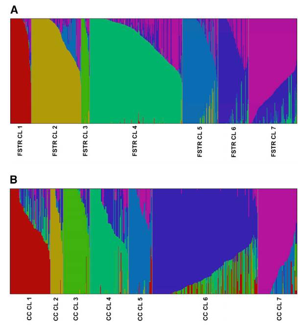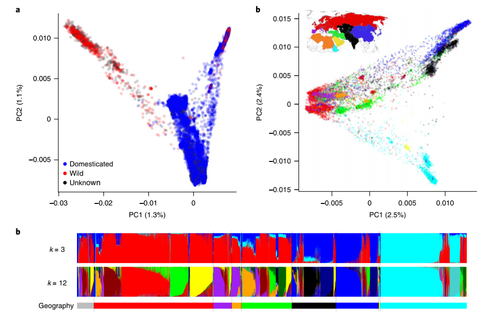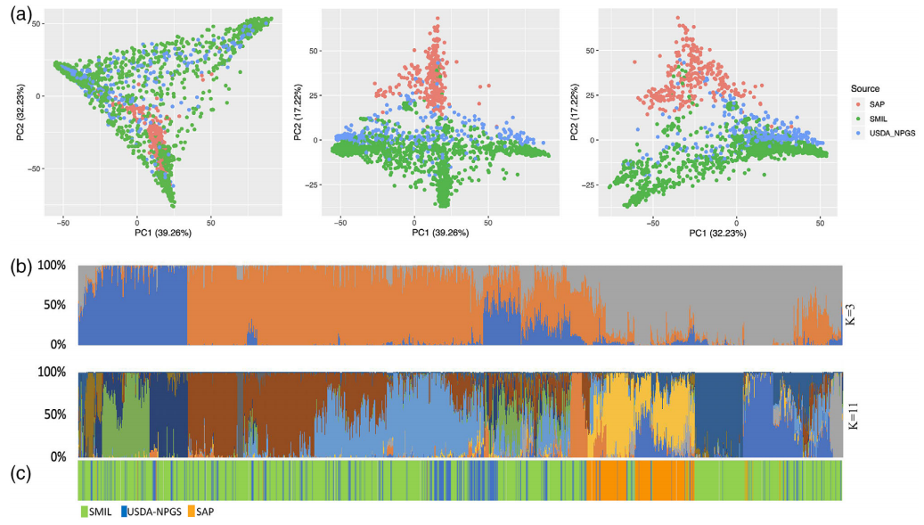 基因庫收集和保存大量植物和詳細的護照信息,目的是保護遺傳多樣性以進行保護和育種。此類集合的遺傳表征有可能闡明重要作物的遺傳歷史,使用標記-性狀關聯(lián)來鑒定感興趣性狀的位點,尋找正在進行選擇的位點,并通過識別分類錯配和重復為基因庫管理作出貢獻。本研究通過GBS測序?qū)碜匀蚧驇斓?0,038個辣椒 (Capsicum spp.) 種質(zhì)進行基因分型,并調(diào)查了這種標志性主食的近期歷史?;赟NP數(shù)據(jù)計算了identity-by-state (IBS) 比例,在基因庫內(nèi)和基因庫之間檢測到多達 1,618 個重復種質(zhì)。進一步深入分析了常見食用辣椒的遺傳多樣性以調(diào)查其歷史,發(fā)現(xiàn)在全球廣泛地區(qū)收集的辣椒種類有很大的重疊。GWAS分析和選擇清除分析發(fā)現(xiàn)辣椒性狀,如刺激性,這些性狀在全球分布不均勻,表明人類偏好對馴化辣椒的遺傳結(jié)構(gòu)產(chǎn)生了主要影響。