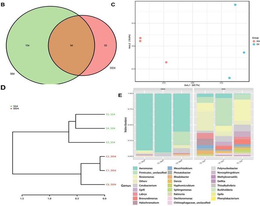 測序樣品:養(yǎng)殖5個月后,隨機各抽取3條魚(饑餓24小時),將腸分為前腸、中腸和后腸段,并用鑷子擠壓將每個片段的內(nèi)容物收集到無菌的2ml收集管中(DD4指對照組樣本,SS4指實驗組樣本)。對應(yīng)的同一樣本腸道組織用于轉(zhuǎn)錄組測序(CT指對照組樣本,ST指實驗組樣本)。