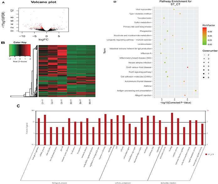 使用與16S測序相同的樣本對黃河鯉新品種(實驗組)和對照組中的轉(zhuǎn)錄組進(jìn)行測序并鑒定差異基因(DEG)。在249個顯著DEGs中(如圖3A),194個基因表達(dá)下調(diào),55個基因表達(dá)上調(diào)。通過GO注釋,這些基因被分為以下功能類別:生物調(diào)節(jié)、細(xì)胞過程、解毒作用、發(fā)育過程、免疫系統(tǒng)進(jìn)程等(都屬于生物過程);細(xì)胞、細(xì)胞部分、胞外區(qū)域、胞外區(qū)域部分、大分子復(fù)合物等(細(xì)胞成分);抗氧化活性、結(jié)合活性、催化活性、分子功能調(diào)節(jié)器上等(分子功能)。聚類分析表明,實驗組和對照組具有不同的特征,DEG分為四個部分(圖3B)。這些基因的GO注釋包括生物學(xué)過程中的13個類別,細(xì)胞成分中的8類和分子功能類別中的7類(圖3C)。KEGG注釋將這些基因中的大部分分配到免疫相關(guān)途徑(圖3D)。