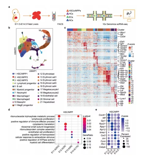 a FL組織的scRNA-seq 實驗流程示意圖。b FL中所有單細胞的UMAP可視化。c熱圖顯示每個細胞簇前20個DEGs的表達模式。d在 FL 發(fā)育過程中,HSC/MPP 中富集的 GO通路。e FL發(fā)育過程中 HSC/MPP 中富集的 DEGs的散點圖。