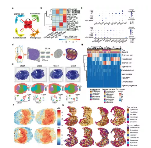 a示意圖展示 HSC/MPP 和生態(tài)位細胞(內(nèi)皮細胞、基質(zhì)細胞、成肝細胞和巨噬細胞)之間的細胞相互作用。b CellPhoneDB 分析展示主要的 HSC/MPP-生態(tài)位細胞相互作用對。c主要的HSC/MPP-生態(tài)位細胞相互作用對的配體(頂部)和相應(yīng)受體(底部)表達模式的散點圖。d 10×Visium ST 實驗流程示意圖。e E14.5 胚胎組織切片的蘇木精和伊紅 (HE) 染色。f組織切片中成肝細胞標(biāo)記物Afp 的表達模式。g熱圖展示了FL斑點的富集分數(shù)。h FL部分空間特征圖。