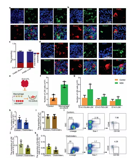 a免疫熒光分析顯示 E14.5 FL 冷凍切片中 F4/80(代表巨噬細胞)和 c-Kit(代表 HSCs/MPPs)的表達。b免疫熒光分析顯示 E14.5 FL 冷凍切片中 F4/80(代表巨噬細胞)和 Runx1(代表 HSCs/MPPs)的表達。C柱狀圖展示有和無細胞相互作用的 HSCs/MPPs 的比例。d免疫熒光分析顯示 E14.5 FL 冷凍切片中 F4/80(代表巨噬細胞)、CD150(代表 HSCs/MPPs)、Mecom(代表 HSCs/MPPs)和 Hlf(代表 HSCs/MPPs)的表達。f源自巨噬細胞和 HSC/MPP 共培養(yǎng)系統(tǒng)的 HSCs/MPPs(LSK 細胞)的數(shù)量。g源自MDK補充培養(yǎng)物的 100 個 HSCs/MPPs(LSK、Flt3 -LSK 和 SLAM-LSK 細胞)的HSCs/MPPs(LSK 細胞)的數(shù)量。h氯膦酸鹽-脂質(zhì)體和對照-脂質(zhì)體處理后 E14.5 FL 中的總細胞數(shù)。i氯膦酸鹽處理前后 E14.5 FL中譜系- (Lin- ) 細胞的比例。j氯膦酸鹽處理前后 E14.5 FL 中 LSK 細胞的比例。k氯膦酸鹽處理前后 E14.5 FL 中 SLAM-LSK 細胞的比例。l流式細胞儀分析顯示E14.5 FL在氯膦酸鹽處理前后Lin -,LSK,SLAM-LSK的細胞比例。