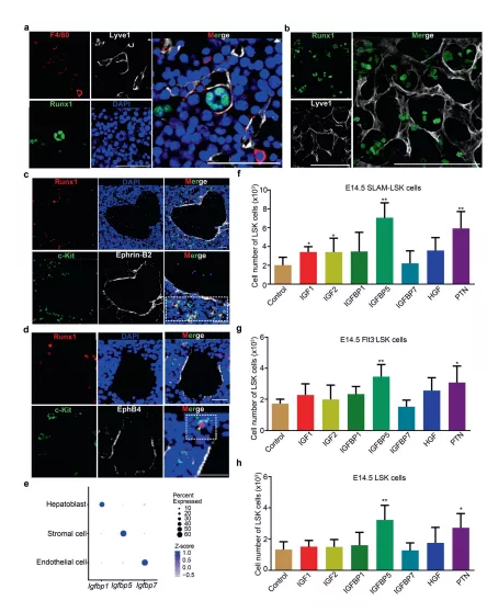a 免疫熒光分析顯示了在 E14.5 FL 冷凍切片中 Lyve1(代表ECs)和 Runx1(代表 HSCs/MPPs)的表達。b免疫熒光分析顯示了 E14.5 FL 冷凍切片中 Lyve1(代表EC)和 Runx1(代表 HSCs/MPPs)的表達。c免疫熒光分析顯示 E14.5 FL 冷凍切片中 c-Kit(代表 HSCs/MPPs)、Runx1(代表 HSCs/MPPs)和 EphrinB2(代表動脈門脈血管)的表達。d免疫熒光分析顯示 c-Kit(代表 HSCs/MPPs)、Runx1(代表 HSCs/MPPs)和 EphB4(代表靜脈)在 E14.5 FL 冷凍切片中的表達。e Igfbp1、Igfbp5和Igfbp7在三種結(jié)構(gòu)生態(tài)位細胞(內(nèi)皮細胞、基質(zhì)細胞和成肝細胞)中的表達模式散點圖。f來自 E14.5 FL 的 100 個 SLAM-LSK 細胞因子培養(yǎng)物的 HSCs/MPPs(LSK 細胞)的數(shù)量。g來自 E14.5 FL的 100 個Flt3-LSK 細胞因子培養(yǎng)物的 HSCs/MPPs(LSK 細胞)的數(shù)量。h來自 E14.5 FL 的 100 個 LSK 細胞因子培養(yǎng)物的 HSCs/MPPs(LSK 細胞)的數(shù)量。
