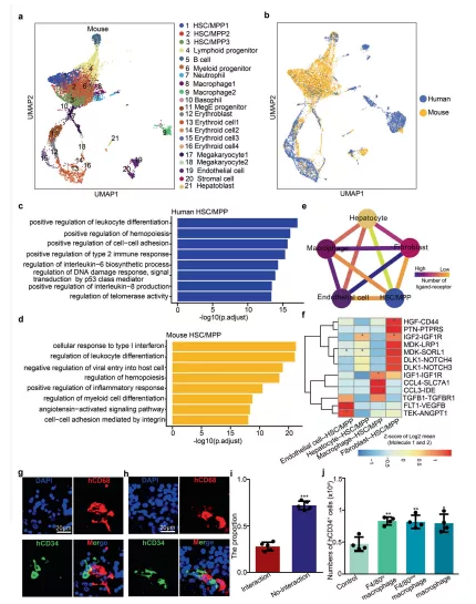 a E14.5 FL中所有細胞類型的UMAP 可視化。b來自小鼠(E14.5)和人類(受孕后 11 周)的 FL 細胞群的 UMAP 可視化。c對人類 HSCs/MPPs中top DEG 進行 GO 生物過程相關(guān)的通路富集分析。d對小鼠 HSCs/MPPs 中top DEG進行GO生物過程相關(guān)的通路富集分析。e配體-受體相互作用網(wǎng)絡(luò)展示了人 HSC/MPP與生態(tài)位細胞之間的潛在通訊網(wǎng)絡(luò)。f熱圖展示主要的人 HSCs/MPPs-生態(tài)位細胞相互作用對。g – h免疫熒光分析展示CD68(代表巨噬細胞)和 CD34(代表 HSCs/MPPs)在人受孕后第 11 周 FL 切片中的表達。i柱狀圖展示有和無細胞相互作用的 HSCs/MPPs 所占的比例。j源自小鼠巨噬細胞和 HSCs/MPPs 共培養(yǎng)系統(tǒng)的人 CD34 + HSCs/MPPs的數(shù)量。