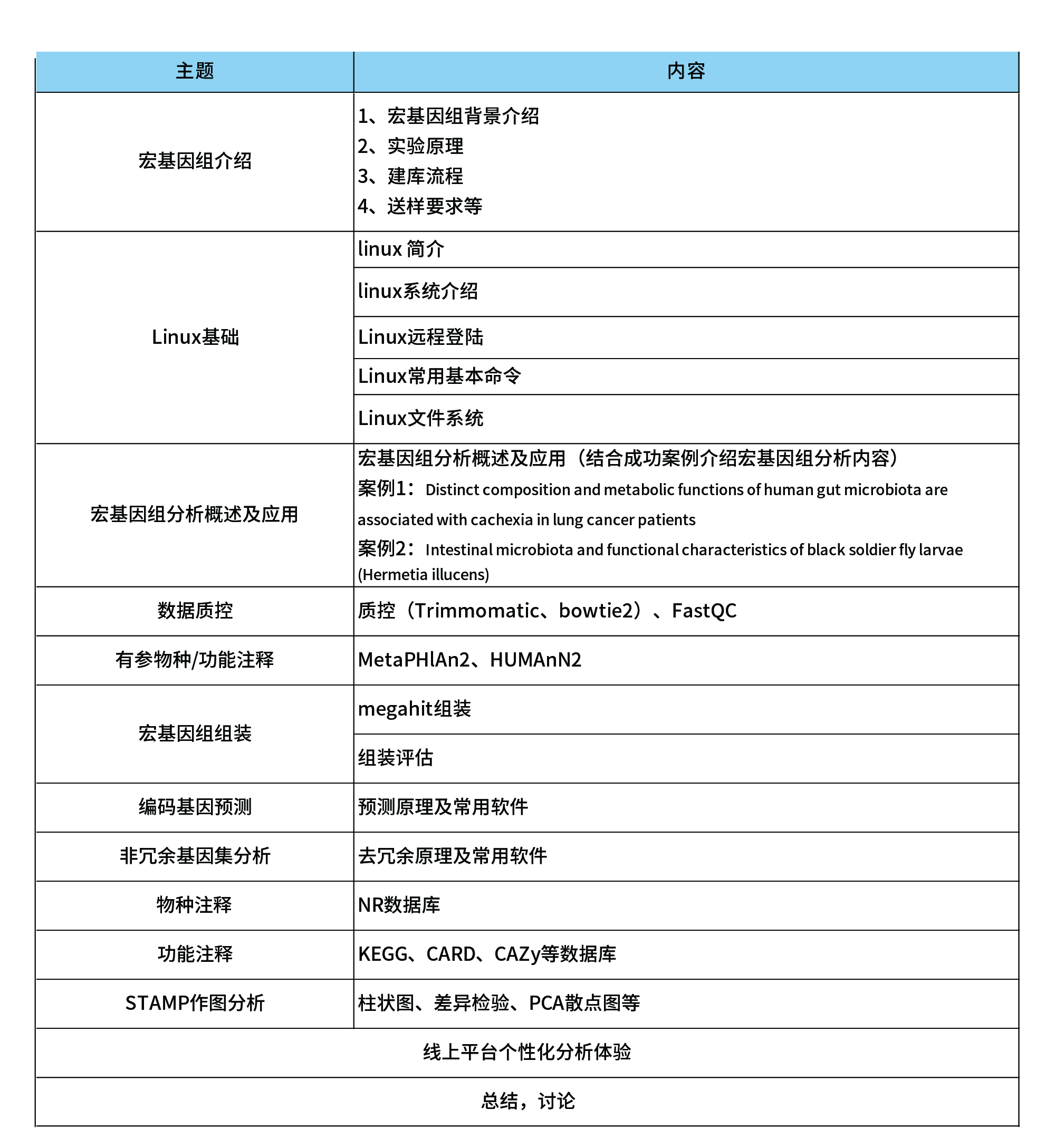本課程從IF=10及4分的SCI文章入手,從宏基因組背景介紹、實(shí)驗(yàn)(實(shí)驗(yàn)測序原理、建庫方法和流程、送樣注意事項(xiàng)等)、分析(下機(jī)數(shù)據(jù)質(zhì)控、有參注釋、無參組裝/預(yù)測/物種注釋/功能注釋等)、可視化作圖,讓您全面了解宏基因組分析每個(gè)過程,并結(jié)合案例文章,讓您了解宏基因組文章思路,助力科學(xué)研究。