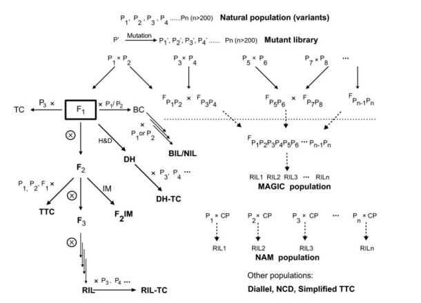 對于動植物群體,通常利用性狀具有顯著差異的兩個親本進行雜交,再通過自交、回交或者其他方式來構建家系群體。家系群體按照遺傳穩(wěn)定性劃分可分為暫時性分離群體和永久性分離群體;如F1、F2、F3、BC等,這類群體中分離單位是個體,一經自交或近交,其遺傳組成就會發(fā)生變化,無法永久使用,所以屬于暫時性分離群體;如RIL、DH等,這類群體中分離單位是株系(或者叫株行),不同株系間存在基因型的差異,而株系內個體間的基因型是相同且純合的,自交不分離。這類群體通過自交或近交繁殖后,遺傳組成不會改變,可永久使用,所以屬于永久性分離群體。