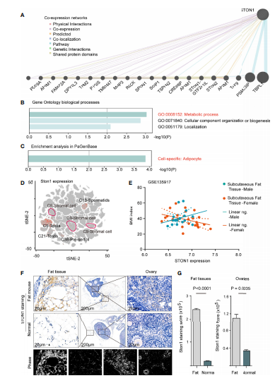 圖3. STON1 與脂肪細(xì)胞的代謝過程相關(guān),并在來自脂肪飲食小鼠的小鼠脂肪和卵巢組織中高度表達(dá)