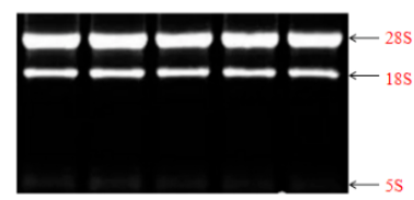 真核生物RNA特有28S、18S、5S三條帶,進行瓊脂糖凝膠電泳分析時,28S條帶的亮度大概是18S條帶的兩倍或者以上,且無拖尾,說明RNA的完整性高、未被其他雜質污染。若出現(xiàn)其他條帶、或者條帶彌散拖尾,建議重新提取RNA。