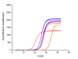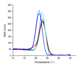 圖7:以1?μg不同物種的RNA為模板(紅色:人肝癌細胞;藍色:雞;黑色:斑馬魚;紫色:水稻種子;黃色:番茄果),用BiomarkerScript Ⅱ 1st Strand cDNA Synthesis Kit進行逆轉錄,得到cDNA產(chǎn)物。再以100 ng不同物種的?cDNA為模板,用Biomarker?2×SYBR Green Fast qPCR Mix進行qPCR擴增。