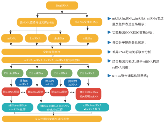 百邁客全轉(zhuǎn)錄組測序服務(wù)是一次檢測,獲得四種分子(mRNA、lncRNA、circRNA、miRNA)信息,針對不同類型的RNA進行表達分析,結(jié)構(gòu)研究以及全新轉(zhuǎn)錄本的發(fā)現(xiàn),并結(jié)合競爭性內(nèi)源RNA(ceRNA)機制,進行聯(lián)合分析,深入挖掘轉(zhuǎn)錄水平調(diào)控網(wǎng)絡(luò),深度探究各類RNA分子的調(diào)控機制。分析內(nèi)容如下: