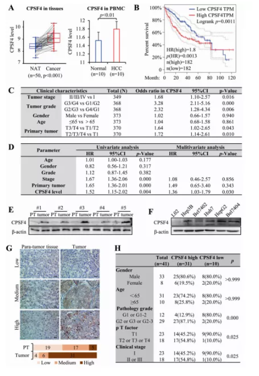 由于CPSF4表達在HCC中顯著增加,并且其高水平表達對應(yīng)于HCC中OS的最高風(fēng)險,因此本研究將重點放在CPSF4上。通過比較50對配對的序列數(shù)據(jù),發(fā)現(xiàn)HCC腫瘤組織中CPSF4表達水平顯著高于正常鄰近組織。來自GSE49515的微陣列數(shù)據(jù)還表明,10名HCC患者的外周血單核細胞(PBMC)樣本中的CPSF4水平顯著高于10名健康對照,這表明CPSF4可以作為HCC診斷的生物標志物(圖 1A)。Kaplan-Meier對364例患者的生存分析顯示,5 年生存率從 CPSF4低表達患者的57%±5%下降到CPSF4高表達患者的42%±5%(p < 0.01,圖 1B)。進一步的相關(guān)分析表明,CPSF4與臨床TNM分期、病理分級和臨床分期顯著相關(guān)(圖 1C)。單變量分析表明HCC患者的OS率與高CPSF4表達之間存在關(guān)聯(lián)(p < 0.01)。多變量Cox回歸分析顯示CPSF4水平(p = 0.03)是OS的獨立預(yù)后因素(圖 1D)。