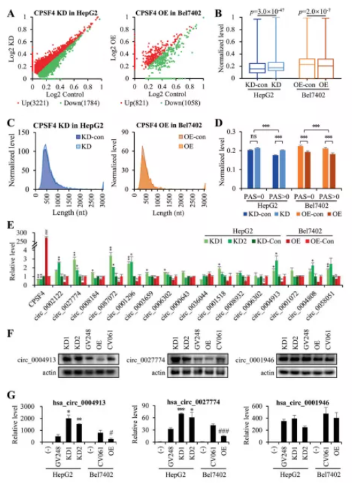 為了驗證,本研究首先從GEO數(shù)據(jù)庫中選擇了HCC組織中807個下調(diào)的circRNA(FC>2,p<0.05);然后從RNA-seq數(shù)據(jù)中篩選了1447個在CPSF4-OE細胞中下調(diào)或在CPSF4-KD細胞中上調(diào)的circRNA。這兩組數(shù)據(jù)取交集,共得到24個circRNA作為驗證的候選circRNA;結(jié)構(gòu)分析表明其中16個含有PAS序列。實時PCR結(jié)果顯示,這16個circRNA中有13個在CPSF4-OE細胞中被抑制,但在CPSF4-KD細胞中被激活(圖 2E)。選擇2個帶有PAS元件的circRNA,hsa_circ_0027774 和 hsa_circ_0004913 作為CPSF4靶向的circRNA;同時,另一個廣泛研究的不含PAS元件的circRNA hsa_circ_0001946作為CPSF4非靶向circRNA。Northern blot結(jié)果表明hsa_circ_0027774和hsa_circ_0004913與CPSF4呈負相關(guān),但hsa_circ_0001946在所有細胞系中保持相同水平(圖 2F)。同時構(gòu)建了這三種circRNA的OE質(zhì)粒并與CPSF4 OE或KD質(zhì)粒共轉(zhuǎn)染,real-time PCR結(jié)果顯示帶有PAS的circRNA(hsa_circ_0027774和hsa_circ_0004913)與CPSF4水平呈負相關(guān),而不含PAS的circRNA(hsa_circ_0027774和hsa_circ_0004913)不受CPSF4的影響(圖 2G),這說明CPSF4在轉(zhuǎn)錄后抑制了circRNA??傊珻PSF4直接調(diào)節(jié)HCC細胞中帶有PAS元件的circRNA的表達。