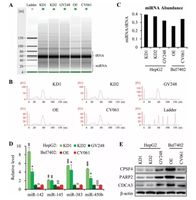 為了測試CPSF4介導(dǎo)的circRNA減少是否會影響miRNA的穩(wěn)定性,從CPSF4-OE和CPSF-KD細胞中提取總miRNA,結(jié)果顯示CPSF4-OE細胞中miRNA(4-40 nt)和tRNA(40-80 nt)的比率降低,但在CPSF4-KD細胞中增加(圖 3A-C),這證實了CPSF4能夠減少miRNA的積累。