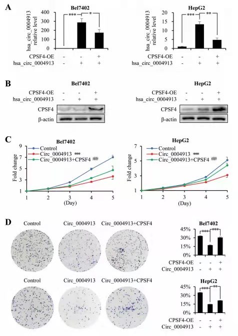 在Bel7402和HepG2細胞中生成hsa_circ_0004913-OE細胞,然后用CPSF4質(zhì)粒轉(zhuǎn)染。分別通過蛋白質(zhì)印跡和實時PCR檢測每個細胞系中的CPSF4蛋白和hsa_circ_0004913表達水平(圖 4A,B)。與對照細胞相比,hsa_circ_0004913-OE細胞顯示出較慢的增殖和較低的克隆形成。然而,CPSF4的OE可以消除hsa_circ_0004913的腫瘤抑制作用,因為CPSF4轉(zhuǎn)染后生長速度和克隆形成能力恢復(fù)(圖 4C,D)。這些結(jié)果表明circRNA在CPSF4介導(dǎo)的HCC細胞腫瘤發(fā)生中的重要作用。