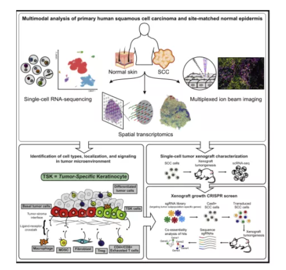 為了確定皮膚鱗狀細(xì)胞癌(cSCC)的細(xì)胞組成和結(jié)構(gòu),該研究團(tuán)隊對10對配對的人體鱗狀細(xì)胞癌組織和正常組織單細(xì)胞RNA測序、空間轉(zhuǎn)錄組和多路離子束成像。識別到四個細(xì)胞亞群,三個正常細(xì)胞亞群以及一個定位于纖維血管邊緣的腫瘤特異性角化細(xì)胞(TSK)群??臻g轉(zhuǎn)錄分析揭示了TSK細(xì)胞作為細(xì)胞間通信的樞紐。最后,人類腫瘤異種移植物的單細(xì)胞特性和體內(nèi)CRISPR篩選確定了特異性腫瘤富集基因亞群和相互作用網(wǎng)絡(luò)在腫瘤發(fā)生中的重要作用。