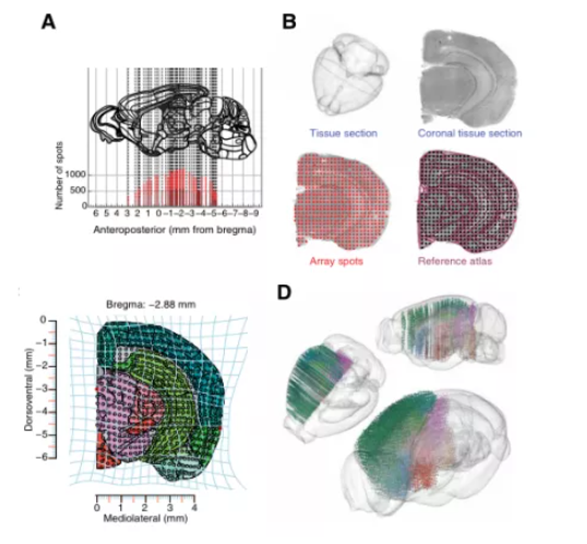 通過使用全腦空間轉(zhuǎn)錄組學(xué)基于對空間定義特征的無偏識別來生成成年小鼠大腦的系統(tǒng)分類。研究發(fā)現(xiàn)分子信息足以推斷大腦的復(fù)雜而詳細(xì)的神經(jīng)解剖組織結(jié)構(gòu)。無監(jiān)督分類顯示了特定于區(qū)域和層的子區(qū)域,在等皮層和海馬體以及紋狀體的新亞區(qū)。分子圖譜進(jìn)一步支持了從單細(xì)胞RNA圖譜中表征神經(jīng)元的空間特性,并提供了使用最小基因集(大腦調(diào)色板)為大腦添加注釋的資源??傊狙芯拷⒘艘粋€分子圖譜來正式定義大腦區(qū)域的空間組織,包括用于映射和靶向離散神經(jīng)解剖結(jié)構(gòu)域的分子代碼,通過空間維度直觀詮釋了大腦組織不同空間區(qū)域特征,為剖析大腦組織提供了全面的時空圖譜。