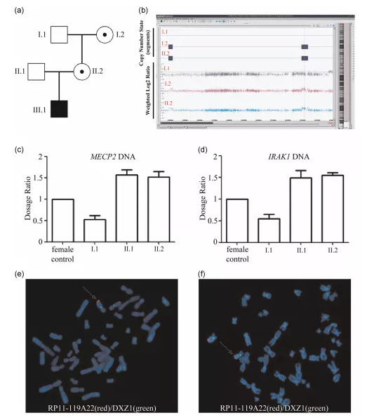 使用SNP微陣列檢測(cè)I.1、I.2和II.2的變化。在II.2和I.2(圖1b)中,在Xq28區(qū)域和Xq27.3區(qū)域分別顯示了437KB的重復(fù)和284KB的重復(fù),這表明Xq28和Xq27.3重復(fù)是母系遺傳的。Xq28區(qū)域包含13個(gè)在線孟德爾人遺傳(OMIM)基因(包括MECP2、IRAK1、L1CAM、NAA10和HCFC1)。通過qRT-PCR以驗(yàn)證結(jié)果,在男性I.1中檢測(cè)到MECP2和IRAK1一個(gè)基因劑量的拷貝,而在正常對(duì)照女性中檢測(cè)到兩個(gè)拷貝,在I.2和II.2中檢測(cè)到三個(gè)拷貝(圖1c,d)。對(duì)女性I.2和II.2的中期染色體進(jìn)行FISH分析,發(fā)現(xiàn)含有MECP2的探針RP11-119A22僅在Xq28處有信號(hào),這表明Xq28重復(fù)是串聯(lián)的,沒有整合到基因組的其他地方(圖1e,f)。