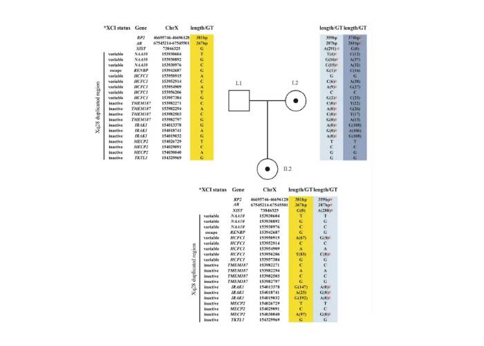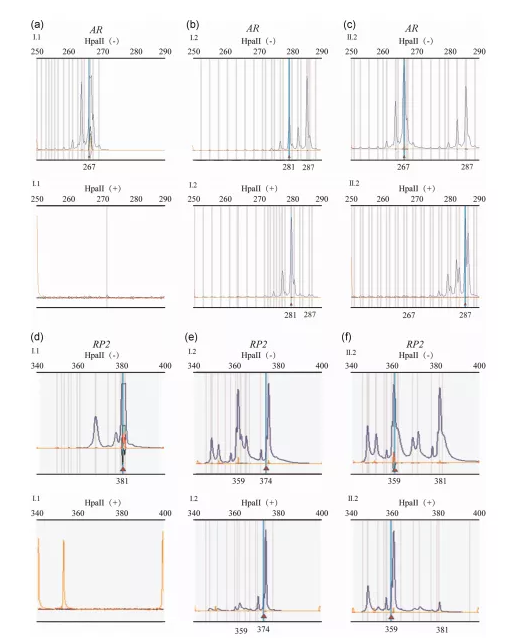 作者進(jìn)行了基于PCR的AR和RP2分析,以評(píng)估外周血中的XCI模式。使用甲基化敏感的限制性內(nèi)切酶HpaII,使PCR只擴(kuò)增非活性X染色體上的等位基因。通過分離分析確定了失活X染色體的起源。