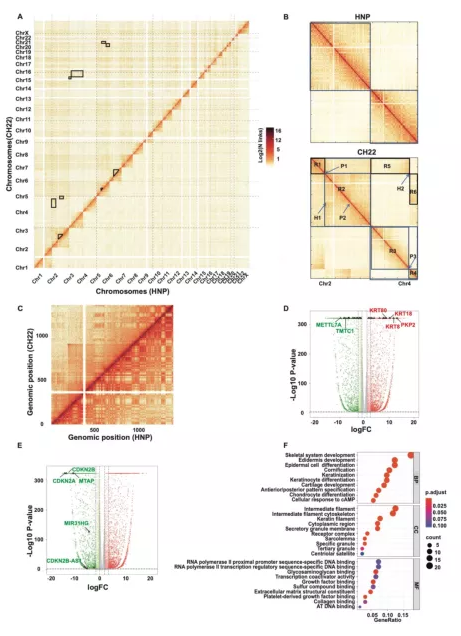 染色體相互作用頻率(IR)能夠反映基因組區(qū)域在細胞核中的相對位置,與轉錄活性相關。在HNP的IR熱圖中,觀察到在富含基因的短染色體(chr16、17、19-22)中IR較高,尤其是在chr21和chr22之間。在CH22中,chr3和chr15、chr5和chr20、chr2和chr4、chr9和chr13、chr12和chr16之間的IR更高,短染色體(chr16-22)之間的IR更低。IR強度和DEGs/DARs無顯著相關性(p = 1)。