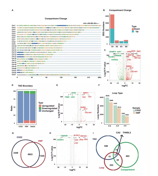 在腫瘤發(fā)生過程中,染色質compartments會進行轉換。與HNP相比,CH22的每條染色體中都發(fā)現(xiàn)了compartments轉換,尤其是在chr1、9、13-16和22(圖3A)。HNP中9.99%的compartments A在CH22中為compartments B,6.06%的compartments B在CH22中為compartments A,從A到B的轉換中基因的表達顯著下調(p=1.08 e-74 ),反之亦然(p=4.11 e- 47 )。