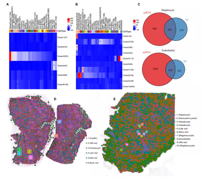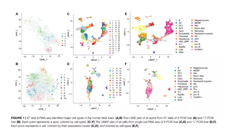 為了研究胎兒肝臟中免疫細胞和紅細胞的發(fā)育,作者利用ST技術(shù)分析了人類肝臟發(fā)育過程中基因表達的時空動態(tài)。在篩選數(shù)據(jù)后,在8周PCW肝臟中檢測到1267個高質(zhì)量spots,平均每個spot包含204,628條reads,檢測到1,132個基因和5,924個UMIs。在17周PCW中,肝臟由3,489個單獨spots組成,平均78,576條reads,8,829個UMI,過濾后每個點檢測到2,266個基因。通過對每個ST陣列的spots進行降維和聚類,根據(jù)基因表達模式在8周PCW肝臟(圖1A)和17周PCW肝臟(圖1B)中確定了6個和10個主要cluster。由于ST缺乏細胞分辨率,作者利用scRNA-seq技術(shù)研究了8周PCW和17周PCW活組織的基因表達異質(zhì)性。在應(yīng)用質(zhì)量控制過濾器和標(biāo)準(zhǔn)化后,scRNA序列數(shù)據(jù)分別25,186個細胞和9,153個細胞組成,每個細胞中有2,454和2,705個獨特表達的基因。為了探索活體器官的細胞組成,作者處理了單細胞數(shù)據(jù),并在8和17周PCW肝臟中鑒定了31和25種細胞狀態(tài),每種狀態(tài)都根據(jù)文獻中已知的標(biāo)記基因進行了注釋(圖1C-F)。作者將這些cluster鑒定為B細胞、樹突狀細胞(DC)、DC1、DC2、早期成紅細胞、內(nèi)皮細胞、HSC_MPP、成纖維細胞、肝細胞、kuper、ILC、晚期成紅細胞、MEMP、肥大細胞、巨核細胞、中成紅細胞、單核細胞、中性粒細胞、NK、pDC、Pre、Pre-B、Pro-B和VCAM1+。