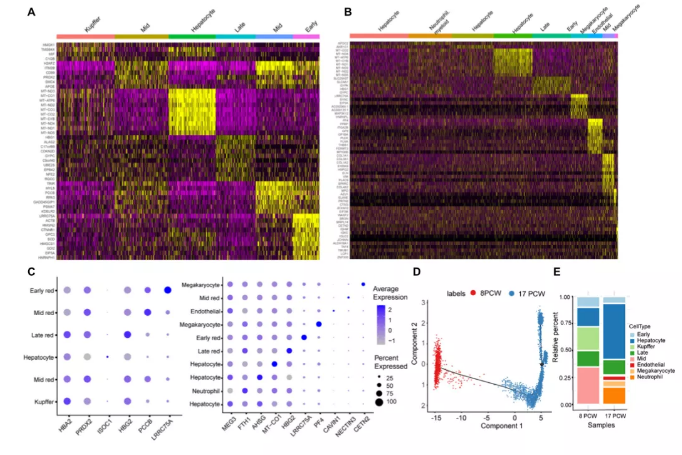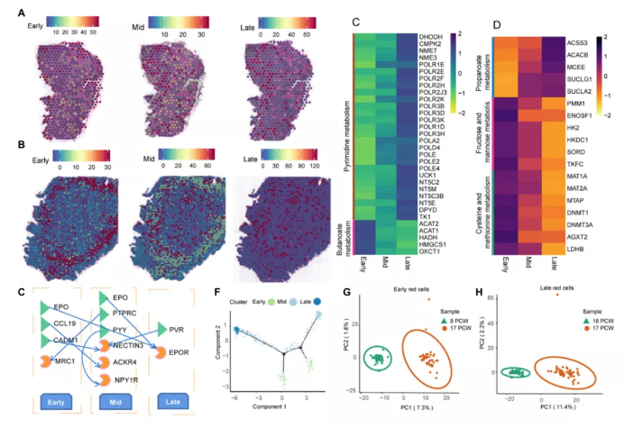 對下調(diào)基因的KEGG富集分析顯示,最顯著的包括果糖和甘露糖代謝、半胱氨酸和蛋氨酸代謝、牛磺酸和低?;撬岽x、組氨酸和硫胺代謝相關(guān)的信號通路。上調(diào)基因的高度富集項與丙酸代謝有關(guān)(圖5D)。作者進行了早、中、晚期細胞間的配體-受體相互作用分析,發(fā)現(xiàn)在早期-中晚期細胞通訊中發(fā)現(xiàn)了促紅細胞生成素(EPO)、蛋白酪氨酸磷酸酶受體C(PTPRC)、連接蛋白細胞粘附分子3(NECTIN3)(圖5E)。此外,還對紅細胞的分化軌跡進行了分析,得出了一條緊密相連的分化軌跡,分化成五個主要分支(圖5F)。這表明系統(tǒng)是通過一個連續(xù)的而不是幾個斷開的譜系來維持的。此外,在8PCW肝臟和17PCW肝臟的早期、中期和晚期紅細胞中分別鑒定了617、674和503個DEGs。為了進一步了解8PCW肝臟和17PCW肝臟之間紅細胞的差異,對兩個胚胎階段的基因表達模式進行了PCA分析。從每種細胞類型中取樣50個點以產(chǎn)生平衡的數(shù)據(jù)集,并且發(fā)現(xiàn)基于它們的轉(zhuǎn)錄相似性可以區(qū)分8 PCW和17 PCW肝臟中的所有點(圖5G,H)。