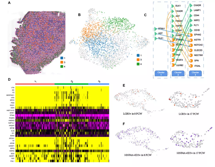 如圖3E所示,肝細胞是17 PCW肝臟的主要實質(zhì)細胞。作者觀察到三個不同的肝細胞cluster(cluster1、3和4)沿著17周PCW肝臟的空間深度分布(圖4A、B)。作者發(fā)現(xiàn)MEG3、ITIH3和HMGCS1呈cluster1高表達。FGB、IGFBP1和A2M基因在cluster3中表達更高,表明區(qū)域DEGs可能參與了相應(yīng)區(qū)域特異性功能的形成。此外,cluster4組中的肝細胞高表達數(shù)個基因,包括MT-CO1、MT-CO2、MT-CO3,它們參與線粒體電子傳遞和氧化磷酸化。值得注意的是,cluster1和3主要聚集在肝組織的中心區(qū)域,cluster4主要聚集在肝的周圍區(qū)域(圖4a)。差異表達分析的熱圖顯示肝細胞分化過程中逐漸下調(diào)或上調(diào)的基因。GO分析表明,1-3-4cluster中逐漸上調(diào)的基因主要與細胞極性通路、Wnt信號通路和GTPase活性的調(diào)節(jié)有關(guān),而逐漸下調(diào)的基因則參與壞死細胞死亡、糖原生物合成過程的調(diào)節(jié),肝臟再生。此外,作者描述了cluster1-3-4細胞之間的細胞通訊(圖4C),為將來的研究提供了潛在的信號轉(zhuǎn)導(dǎo)信息。值得注意的是,盡管cluster3和cluster1的距離更近,但cluster3與cluster4細胞的信號轉(zhuǎn)導(dǎo)比cluster1細胞更為顯著。此外,作者還發(fā)現(xiàn)了一些共享的和活躍的配體-受體對,如DLK1-NOTCH2、EFNA1EPHA2、AGT-AGTR1,這些配體-受體對既存在于cluster1細胞與cluster4細胞的細胞通訊中,也存在于cluster3細胞與cluster4細胞的細胞通訊中。