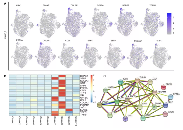 為了進一步揭示這一現(xiàn)象,作者分析了這17種肝病相關(guān)基因在17PCW胚胎腎臟中的表達水平。除PECAM1外,其余基因在17PCW腎中表達。但其表達模式與肝臟不同,主要不在巨核細胞和內(nèi)皮細胞中表達,說明這些肝病相關(guān)基因在胚胎肝臟中具有獨特的基因表達模式。此外,對這17個肝病相關(guān)基因的蛋白質(zhì)相互作用網(wǎng)絡(luò)分析顯示TGFB1、COL1A1、SPP1、PECAM1和THBS1在表達網(wǎng)絡(luò)中起關(guān)鍵作用,而PDE5A與其他基因沒有相互作用(圖6C)。