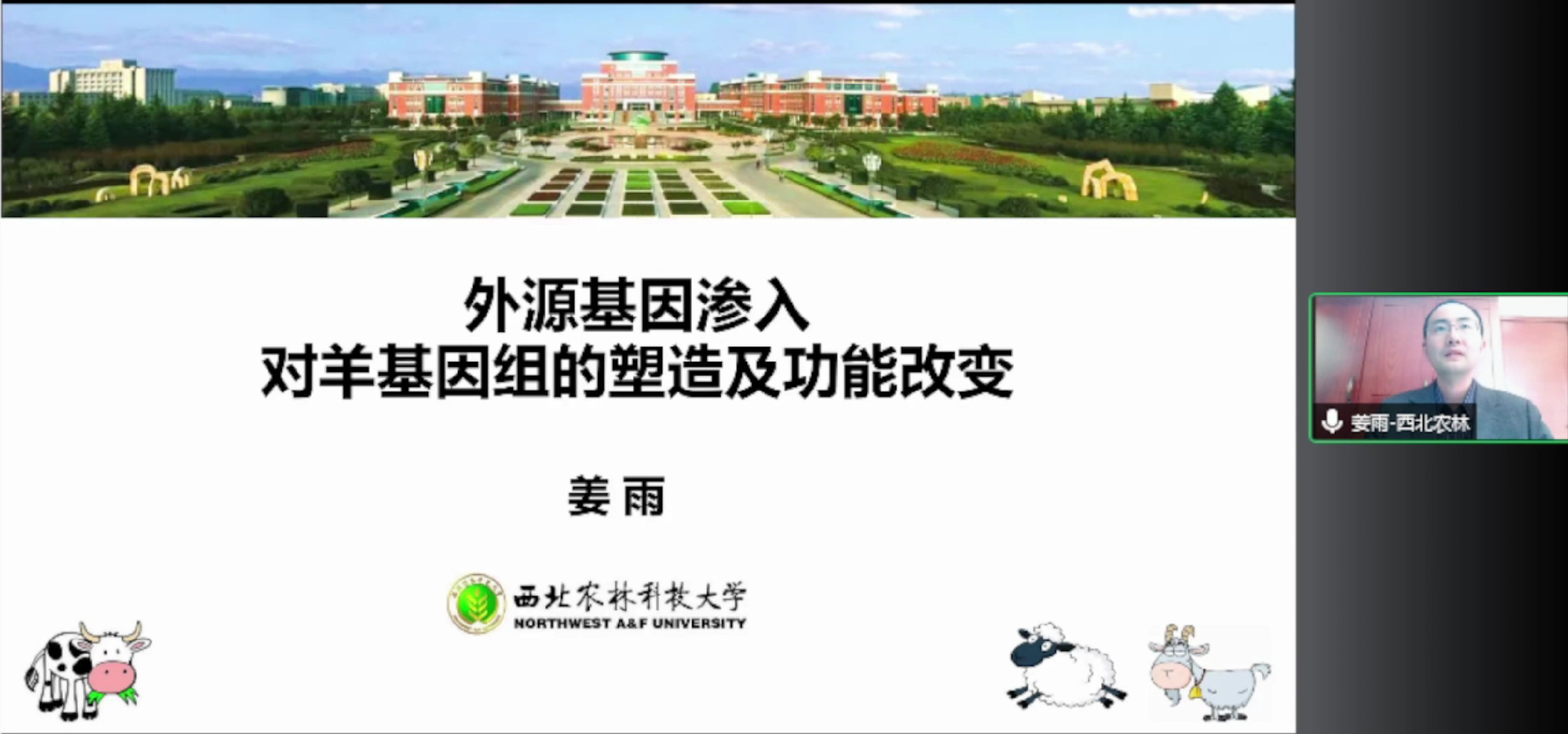 西北農(nóng)林科技大學姜雨教授報告詳述了基因滲入對羊基因組的塑造及其功能改變,其研究團隊通過代表了170多個世界綿羊品種和七個綿羊?qū)僖吧锓N的全基因組序列分析,發(fā)現(xiàn)平均每只家養(yǎng)綿羊的基因組序列分別來自于伊朗的野生摩佛倫羊、東方盤羊和東亞盤羊的雜交滲入。說明起源于野生物種并滲入家養(yǎng)綿羊的獨特單倍型在表型多樣性和綿羊本地化適應中起著重要作用。并發(fā)現(xiàn)綿羊的大角、小角、無角以及耳朵大小性狀相關基因。最后表示,從多個近緣野生物種、馴化祖先種的不同群體之間發(fā)生的滲入事件持續(xù)發(fā)生,遠比想象的復雜,需要結(jié)合歷史和地理的遷徙知識討論。滲入單倍型在多種功能上發(fā)揮作用,其與已存在變異、新發(fā)突變通過快速組合,適應新的環(huán)境。