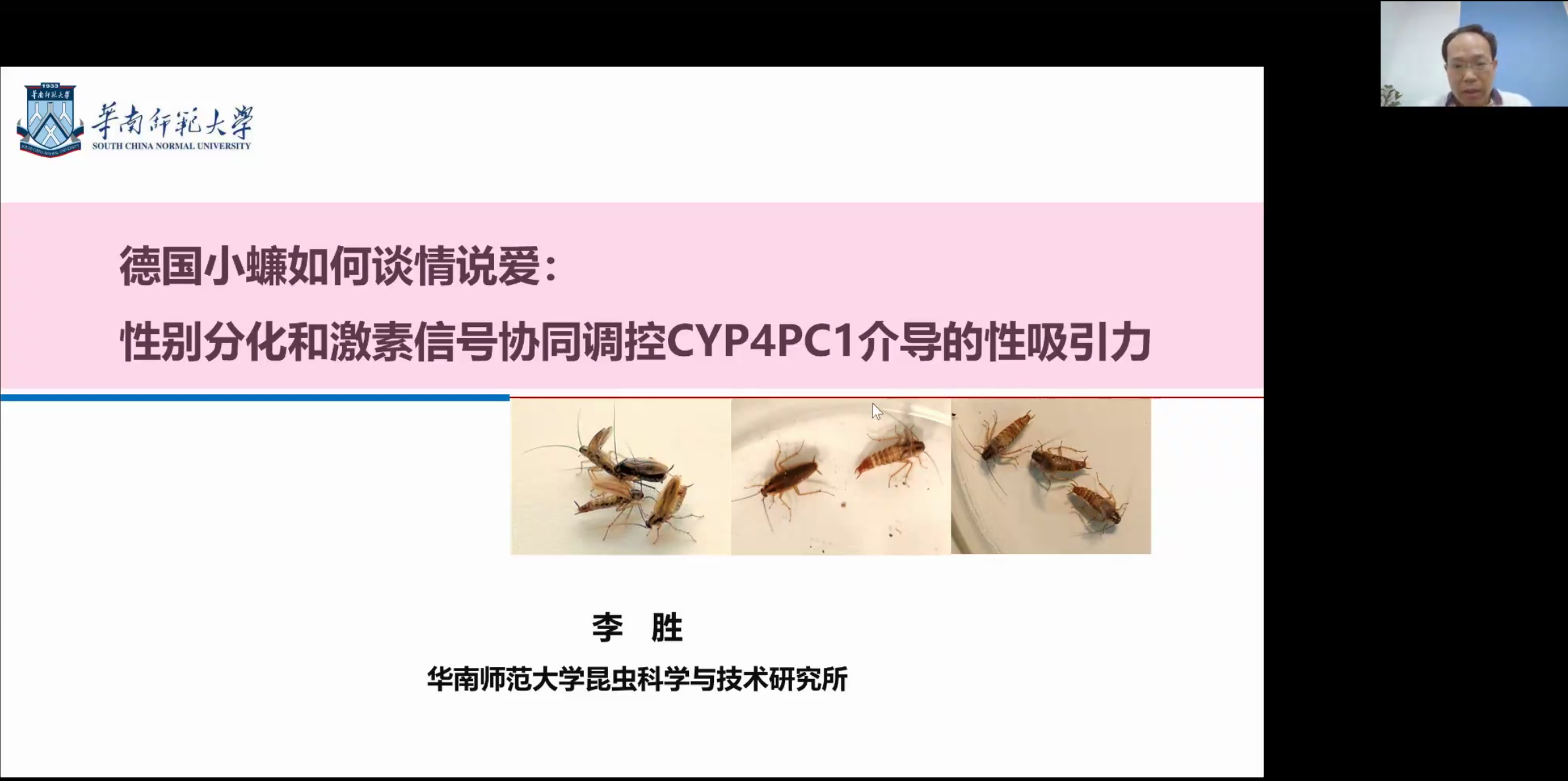 華南師范大學李勝教授風趣的為我們介紹了德國小蠊性激素調(diào)控相關研究。研究團隊通過轉(zhuǎn)錄組及相關驗證實驗,在觸角中找尋到雄蟲中表達量高于雌蟲基因的CYP4PC1基因,該基因可能是控制信息素合成的關鍵基因。通過基因敲除的方式進一步從表型中驗證了CYP4PC1在信息素的產(chǎn)生和求偶的過程中具有重要的作用。后續(xù)研究表明,性別分化基因控制性二型CYP4PC1表達與調(diào)控,性別分化和激素信號協(xié)同調(diào)控CYP4PC1性吸引力,并使得小蠊成熟時只有一種性別具有性吸引力。最后李教授表明,通過性別分化和激素信號協(xié)同調(diào)控性吸引力可能在昆蟲和哺乳動物中普遍存在。