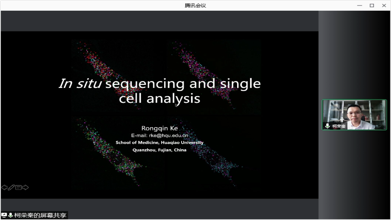 午后休息結(jié)束,華僑大學(xué)醫(yī)學(xué)院柯榮秦教授帶來的報(bào)告是:原位測(cè)序技術(shù)與單細(xì)胞分析?;趩渭?xì)胞測(cè)序的基因表達(dá)分析需要將單個(gè)細(xì)胞從組織中分離出來,這個(gè)過程使所分析的單細(xì)胞丟失了空間位置信息。柯老師團(tuán)隊(duì)開發(fā)了原位測(cè)序(in situ sequencing, ISS),是一種基于成像的空間轉(zhuǎn)錄組學(xué)技術(shù)。該技術(shù)可以在細(xì)胞甚至亞細(xì)胞分辨率下提供低通量到高通量的空間基因表達(dá)信息,將ISS技術(shù)應(yīng)用于癌癥組織中基因表達(dá)異質(zhì)性的可視化分析,并將之應(yīng)用于人腦組織單細(xì)胞測(cè)序所獲得的感興趣的基因的定位以補(bǔ)充其失去的空間位置信息。此外,還開發(fā)了一系列新型的具有更高的檢測(cè)靈敏度和更好的分辨率的單分子RNA原位雜交方法,可以在細(xì)胞和組織中對(duì)感興趣的RNA轉(zhuǎn)錄本進(jìn)行原位成像分析。我們相信我們所開發(fā)的原位RNA表達(dá)分析技術(shù)具有廣泛地用于生物和醫(yī)學(xué)的研究的潛力。