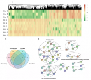 為了探討針刺治療心肌梗死的機(jī)制,作者利用納米孔完成了不同組的基因表達(dá)檢測(cè)。RNA-seq結(jié)果顯示,與對(duì)照組相比,MI組有5083個(gè)差異表達(dá)基因,PC6組與MI組相比有324個(gè)差異表達(dá)基因。通過(guò)聚類分析將對(duì)照組、MI組和PC6組中上調(diào)和下調(diào)基因制作熱圖和維恩圖,發(fā)現(xiàn)MI組2773個(gè)差異基因上調(diào),針刺治療下調(diào)了其中的65個(gè)差異基因,同時(shí),在MI組的2308個(gè)下調(diào)的差異基因中,針刺治療可逆轉(zhuǎn)19個(gè)差異基因的表達(dá)。作者推測(cè)這84個(gè)差異基因可能是針刺抗心肌缺血作用的關(guān)鍵靶點(diǎn)?;赟TRING數(shù)據(jù)庫(kù)對(duì)MI和PC6共同調(diào)控的差異基因進(jìn)行蛋白-蛋白相互作用(PPI)網(wǎng)絡(luò)分析。結(jié)果表明,蛋白質(zhì)主要富集了4類,主要包括:炎癥反應(yīng),肌動(dòng)蛋白細(xì)胞骨架的調(diào)節(jié),I型干擾素介導(dǎo)的信號(hào)通路,以及RNA聚合酶II基因DNA在核外周的轉(zhuǎn)錄依賴鏈。