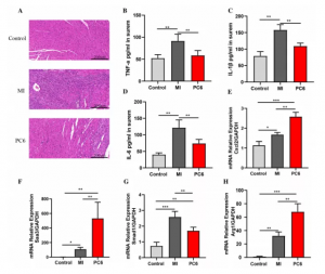 為了探討針刺PC6穴對(duì)心肌損傷的影響,作者首先評(píng)估了心功能和梗死面積。超聲心動(dòng)圖結(jié)果顯示MI組的EF(ejection fraction)和FS(fractional shortening)均較對(duì)照組明顯降低。PC6穴位治療后,EF和FS均增加。針刺治療5天后, 采用TTC染色檢測(cè)梗死面積。結(jié)果顯示,針刺治療顯著減小心肌損傷的大小。采用ELISA法測(cè)定反映急性心肌損傷的心肌特異性血清酶,包括心肌肌鈣蛋白T (cTnT)和心肌肌鈣蛋白I (cTnI)的水平。結(jié)果表明,心肌梗死術(shù)后cTnT和cTnI水平升高,針刺可顯著降低血清酶水平。