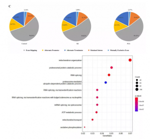 差異AS分析結(jié)果顯示,本研究共鑒定出347個(gè)差異AS事件,其中上調(diào)174個(gè),下調(diào)173個(gè)。AS上調(diào)事件數(shù)量與AS下調(diào)事件數(shù)量相同。與對(duì)照組相比,MI組有129例AS事件差異上調(diào),147例AS事件差異下調(diào)。與MI組相比,PC6組有45個(gè)AS事件差異上調(diào),26個(gè)AS事件差異下調(diào)。通過(guò)GO和KEGG富集分析,作者發(fā)現(xiàn)這些基因富集的前10個(gè)通路包括核糖體、HIF-1信號(hào)通路、肥厚型心肌病、擴(kuò)張型心肌病。結(jié)果表明,這些參與差異AS事件的基因與心臟病有關(guān)。