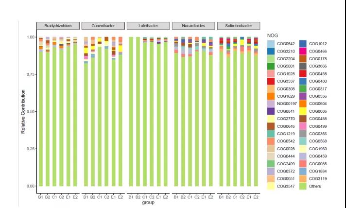 根據(jù)樣本的物種、功能的對應關(guān)系,進行物種與功能相對豐度的關(guān)聯(lián)分析,可以得到特定物種的功能貢獻度、特定功能的物種貢獻度。該分析既可以指定kegg、eggNOG、GO、Pfam、CAZy、CARD、VFDB、PHI-base、P450數(shù)據(jù)庫的TOP/高豐度功能或代謝途徑主要存在于哪些物種,也可以分析TOP/高豐度物種的主要功能或代謝途徑。