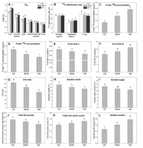 實驗材料:紅富士蘋果(7齡;中國東北部山東省煙臺市)。對照組CK:正常尿素處理組(300 kg N/hm2,每棵樹435 g尿素);實驗組MHN:中高氮處理組(600 kg N/hm2,每棵樹870 g尿素);實驗組HN:高氮處理組(800 kg N/hm2,每棵樹1160 g尿素)。在開花后183天進(jìn)行13C標(biāo)記。