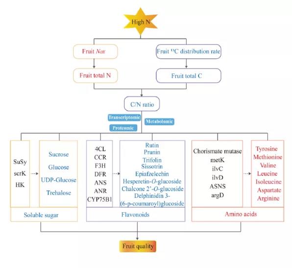 高氮增加了果實對15N的吸收和調(diào)節(jié)能力,降低了C在果實中的分配率,從而導(dǎo)致蘋果果實的總N增加,總C和C/N比率降低。高氮破壞了蘋果C?N平衡,降低了蘋果果實的可溶性糖和總黃酮含量,進(jìn)而使果實品質(zhì)惡化。基于多組學(xué)分析,揭示了高氮對初級代謝和次級代謝互作網(wǎng)絡(luò)。高氮調(diào)節(jié)了蘋果果實中基因和蛋白質(zhì)的表達(dá),抑制了碳水化合物和黃酮類化合物的積累,更多的碳骨架被用來合成氨基酸及其衍生物并轉(zhuǎn)移到氮代謝中。本研究揭示了高氮導(dǎo)致蘋果果實糖和類黃酮含量下降的機理,并獲得了關(guān)鍵候選基因和蛋白質(zhì)。