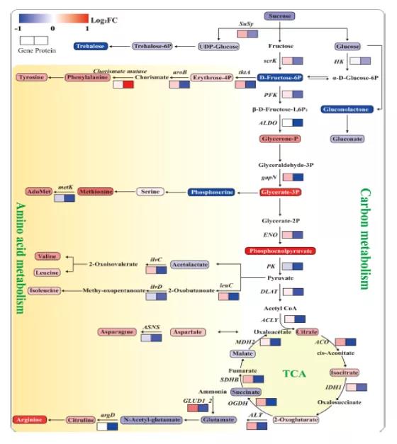 C代謝包括淀粉和蔗糖代謝、糖酵解和TCA循環(huán)。高氮總體下調(diào)了C代謝中蛋白質(zhì)(Susy、scrK和HK)的豐度和碳水化合物(蔗糖、葡萄糖和海藻糖)的積累。相反,糖酵解中間產(chǎn)物卻明顯積累,如甘油-P、甘油酸-3P和磷酸烯醇式丙酮酸。這表明蛋白質(zhì)(ALDO、gapN和ENO)與這些中間代謝物之間存在負(fù)相關(guān)。糖酵解亞型的增加表明,高氮加速了C在呼吸途徑中的流動。氨基酸與碳代謝密切相關(guān),是氮分配的主要形式。氨基酸生物合成途徑中的大多數(shù)蛋白質(zhì)表達(dá)下調(diào)(脊索酸變位酶除外),而大多數(shù)氨基酸及其中間產(chǎn)物表達(dá)上調(diào)(圖5)。以前的研究表明,隨著氮供應(yīng)的增加,非結(jié)構(gòu)性碳水化合物中的一部分C被并入氨基酸和蛋白質(zhì)中。以氨基酸形式的氮增加,使氮儲存更具成本效益。因此,C向N代謝的轉(zhuǎn)移是導(dǎo)致高氮條件下碳水化合物減少的一個重要因素,這使得水果中氨基酸和總氮含量的顯著增加。甘油酸-3P和磷酸烯醇式丙酮酸的增加是氨基酸生物合成所需C骨架增加的重要指標(biāo)。