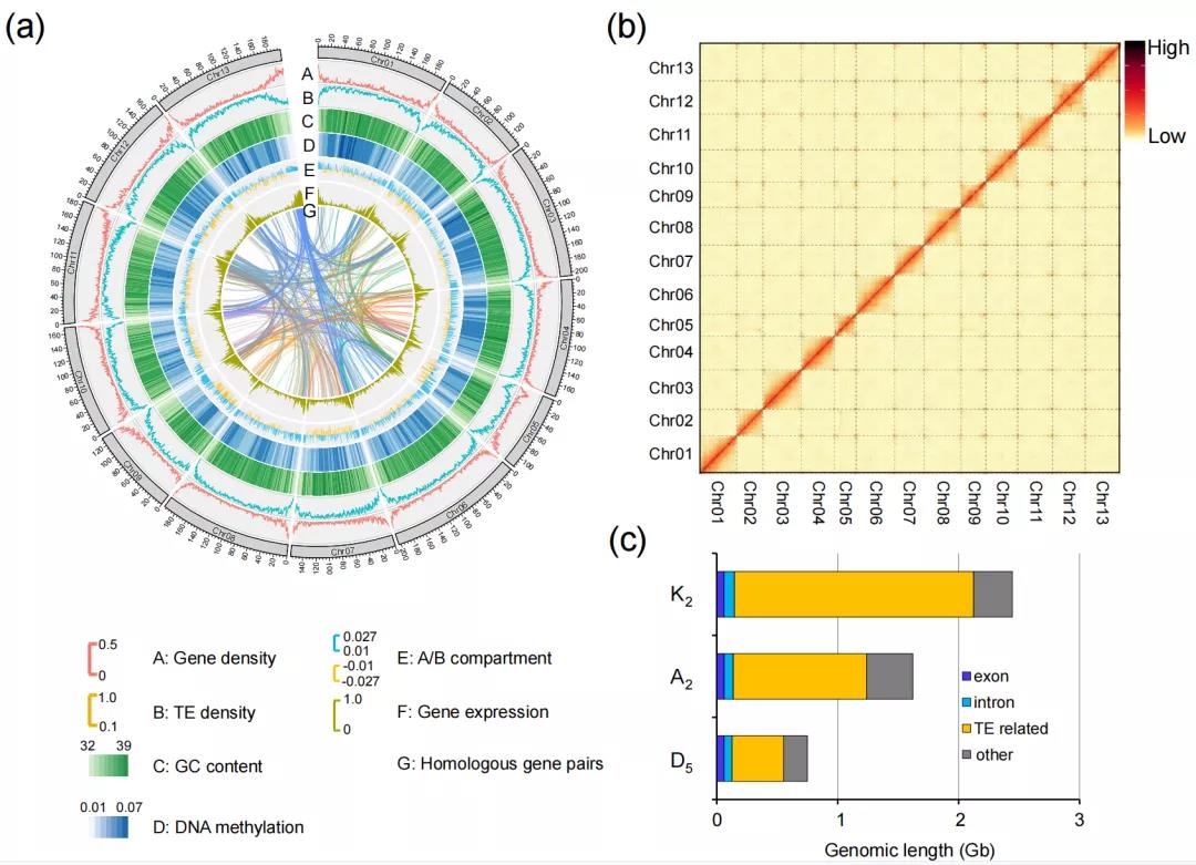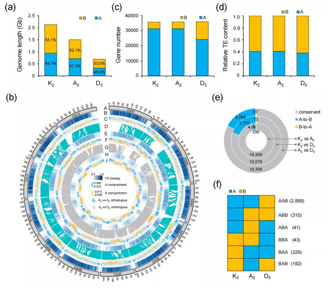 植物染色質(zhì)被劃分為“活性”(A)或“非活性”(B)區(qū)域,通常分別對應(yīng)于常染色質(zhì)和異染色質(zhì)。HiC染色質(zhì)互作分析發(fā)現(xiàn),與基因組大小的差異一致,與A2或D5相比,K2基因組的活躍區(qū)域(約占基因組的44%)較少,而非活躍區(qū)域(55%)較多。較大的K2和A2基因組在A/B compartment之間表現(xiàn)出更多的插入,與這些較大基因組中發(fā)現(xiàn)的富含TE的區(qū)域相對應(yīng)。A2/K2與D5相比多了約7000個基因,這與活躍的轉(zhuǎn)座子擴增相關(guān)。對于較大的基因組,一個compartment中TEs的比例也稍大,表明這些較大基因組(K2和A2)所顯示的A/B compartment變化模式導致更擴散的邊界,并在A compartment中包含更多的基因和TEs。