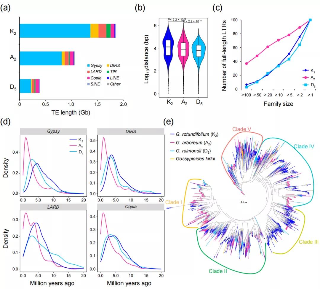 本次研究首次公布了棉屬中二倍體圓葉棉基因組,并對亞洲棉和雷蒙德氏棉基因組進行了升級,解析了轉(zhuǎn)座子活動驅(qū)動的基因組大小進化特征,從轉(zhuǎn)座子擴增和染色質(zhì)空間結(jié)構(gòu)角度為棉花物種進化提供新的見解,為植物中轉(zhuǎn)座子活動介導的轉(zhuǎn)錄調(diào)控進化研究提供參考。