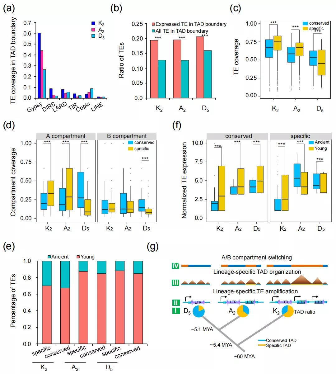 轉(zhuǎn)座因子(Transposable elements,TEs)在真核生物基因組結(jié)構(gòu)的形成中起著重要作用。TE擴增和消除影響物種的表型變異、基因轉(zhuǎn)錄、基因組進化和群體多樣性。最近的研究表明TEs也可能影響3D基因組結(jié)構(gòu),而在植物中,差異TE積累引起的基因組大小的顯著變化對染色質(zhì)高級結(jié)構(gòu)進化的調(diào)節(jié)作用仍然未知。